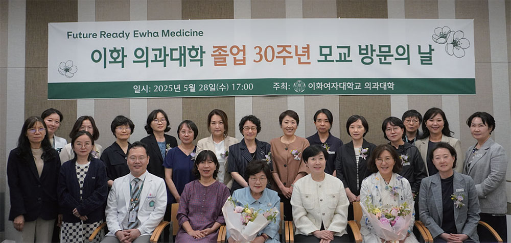 2025년 이화의대 졸업 30주년 기념행사가 5월 28일, 이화여대 의학관 대회의실에서 열렸다. 이날 행사에는 44기 동창들(양훈진 동창 외 16명)과 강덕희 의과대학장, 피상순 의대 동창회장, 우소연 교무부학장, 김관창 기획부장, 윤혜전·우재희 기획차장이 참석해 자리를 빛냈다. 30년 만에 다시 모인 동문들은 서로를 반가워하며 이화의 과거와 현재, 그리고 미래를 함께 그려보는 뜻깊은 시간을 가졌다. 본 행사에 앞서 진행된 이화의료원 투어는 보구녀관 방문으로 시작되었다. 동창들은 이화의대의 역사적 상징인 보구녀관 앞에서 기념사진을 촬영한 뒤, 이대서울병원의 웰에이징센터와 국제진료센터를 둘러보며 이화의료원의 글로벌화된 현재를 직접 확인했다. 이어 방문한 동대문역사센터에서는 이대동대문병원의 발자취를 되돌아보며 이화의 전통을 되새기는 시간을 가졌다. 병원 발전기금 기부자 명단에서 익숙한 동문의 이름을 발견한 참석자들은 이화의료원을 지탱해온 수많은 동문들의 헌신에 깊은 감동을 받았다.