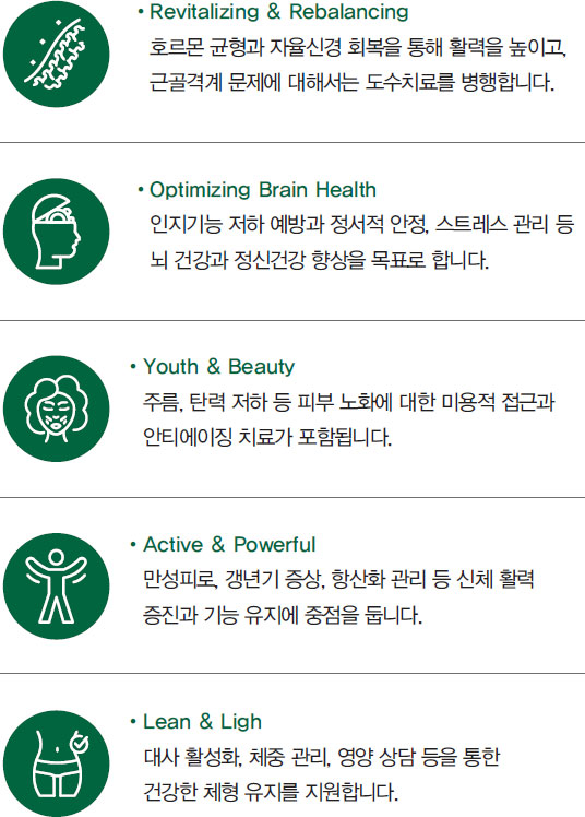 이화의료원 웰에이징센터는 ‘잘 나이 드는 삶(Well-Aging)’을 위한 통합진료 공간입니다. 단순히 질병을 치료하는 데 그치지 않고, 개인의 건강 상태, 생활 습관, 심리적 요인을 함께 고려해 전 생애에 걸친 맞춤형 건강 설계를 제공합니다. 우리 센터는 단순히 노화를 늦추는 것이 아니라, 존엄하고 건강하게 나이 들어갈 수 있도록 돕는 것을 목표로 합니다. 의학적으로는 고혈압, 당뇨병 등 만성질환의 예방과 관리, 근감소증, 인지기능 저하의 조기 발견과 예방, 갱년기 건강 관리 등 생애 전반의 건강 문제를 통합적으로 다루고 있습니다. 정신적·사회적 건강까지 포괄하는 전인적 접근을 바탕으로 운영되는 ROYAL Program(Rejuvenation Of Your Active Life)은 신체적·정신적 노화의 주요 요소를 과학적으로 평가하고, 개별 맞춤 치료를 통해 웰에이징을 실현하는 대표 통합의료 프로그램입니다. 신체가 나이 들면서 가장 크게 영향을 받는 부분은 주름과 피부 탄력 저하, 근골격계 불균형 같은 외적인 변화와 인지기능 저하, 스트레스, 수면 장애, 만성피로, 호르몬 불균형, 대사 이상 같은 내적인 변화로 구분됩니다. ROYAL 프로그램은 이러한 핵심 요소들을 의학적 근거 기반의 표준화된 프로토콜로 진단하고 치료함으로써 단순한 외모 개선을 넘어 전신의 균형과 활력 회복에 중점을 둡니다. 프로그램은 다음의 5가지 핵심 영역으로 구성되어 있으며 각 영역별 맞춤 진료에 더해 예방접종 및 건강검진 서비스를 연계해 적극적인 관리를 돕고 있습니다.
